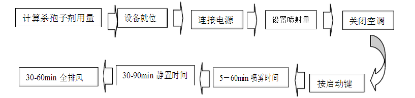 ⑸ 性價比極高,不到氣化過氧化氫設備20-30分之一的成本,達到滅菌效果 ⑹ 整個消毒過程時間短,所以相比甲醛熏蒸使停產時間大大縮短 滅菌流程