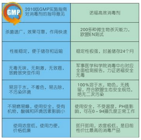 3 具備高適用性:諾福不受溫度,光照,PH值影響,這點幾乎克服了其他所有消毒產品的缺點,我們知道目前的消毒產品,無一例外的會受到PH值,溫度的影響,從而失效或者需要增加用量(用量的增加,意味著腐蝕性,濃度的增加,意味著GMP車間的易清洗程度增加)