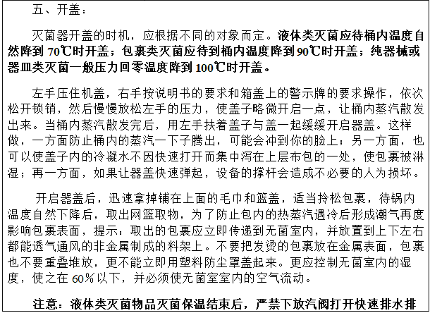 (10) 滅菌結束,在開蓋時合取物時,操作者應戴長統涂膠手套,一定按“開蓋”章節要求操作。否則,桶內騰出的高溫蒸汽和還處高溫的物體會燙傷皮膚。 (11)手柄鎖銷轉動只能一個一個按蓋子上警示牌要求進行,jue不能同時兩個手柄同時操作。