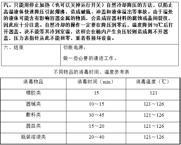 (9)液體滅菌結束后,不能立刻通過下放汽閥或放水閥排汽降壓。而應采用自然冷卻方法降壓、降溫,當壓力降到零同時溫度達到70℃后,才能開蓋取物。也jue不要待其自然冷卻到室溫,以防產生負壓,設備受損。